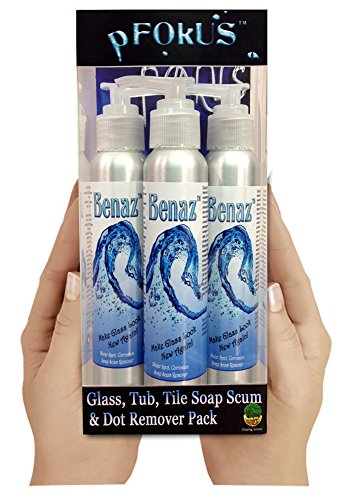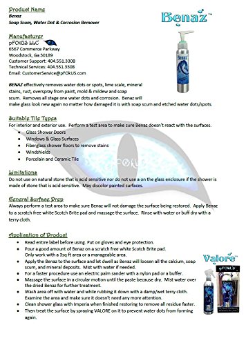 -. Feature : Removes Hard Water Dots From Shower Glass, Mirrors, Tile, Grout, Fiberglass and Windows / Benaz is more expensive to manufacture as it is biodegradable / Benaz will remove stains off cultured marble or plastic shower floor basins / How to remover cloudy white etching on shower glass. Use Valore to maintain after that. / Remove acid rain etching, sap, tar, etc off your car windshield or windows