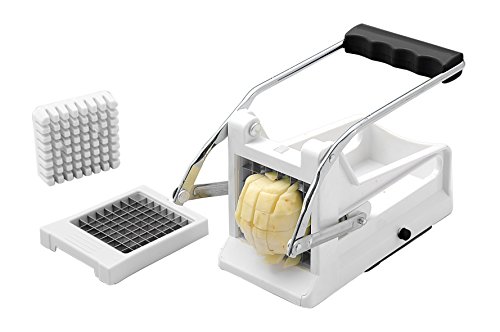 Handmade Made Easy Don't bother with complicated electric machines and other dangerous models. This handheld French fry slicer keeps you in control. Just dice your potato in half or quarters, place in front of the blade, and pull the easy grip handle.
