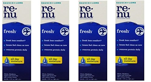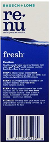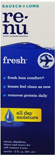 Studio : Bausch and Lomb Publisher : Bausch and Lomb Binding : Health and Beauty Product Description With Renu fresh multi-purpose lens solution, your eyes will enjoy a fresh lens feeling when you put on your contact lenses. Removes protein, cleans, conditions and disinfects your contact lenses. Clinically proven ingredient ensures excellent protein removal. No protein buildup means clean contacts and clear vision. Unsurpassed in fighting germs so your can wear contact lenses with confidence. 0
