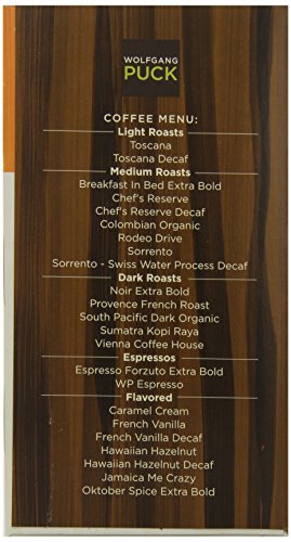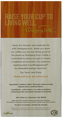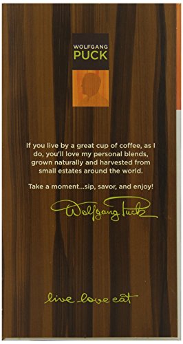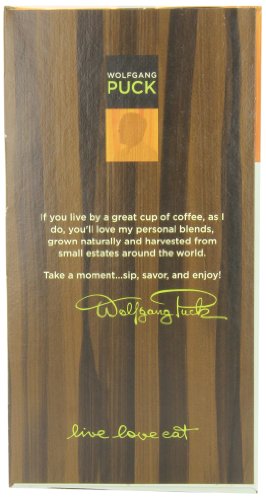 ReleaseDate : 2008-07-08 Studio : Wolfgang Puck Publisher : Wolfgang Puck Binding : Grocery Product Description Wolfgang's secret blend recipe yields a full-bodied cup with chocolate notes. All Wolfgang Puck Coffees are estate grown at high altitudes where the coffee cherries ripen slowly to allow their unique flavors and aromas to fully develop. Our coffees are selected from the top 5% of the world's coffee production, then blended and roasted according to Wolfgang's personal recipe. 0