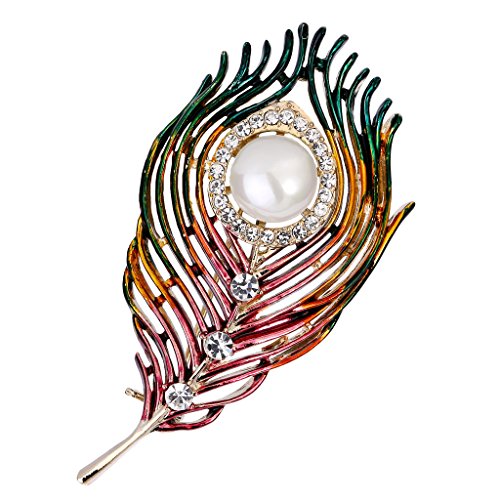 -. Title : EVER FAITH Austrian Crystal Simulated Pearl Enamel Elegant Peacock Plume Brooch Clear Gold-Tone