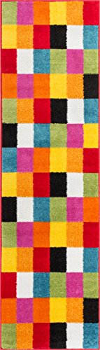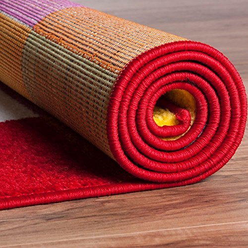Extremely durable and soft area rug. This rug adds a pleasant touchy to any floor with its simple, stylish and clean design. Multi color geometric color block boxes design is bright and vibrant with green, orange, pink, red, blue, yellow, white, and black. Stain and fade resistant. The 100% jute backing is safe for wood floors and all four sides of the rug are serged for improved durability.Feature