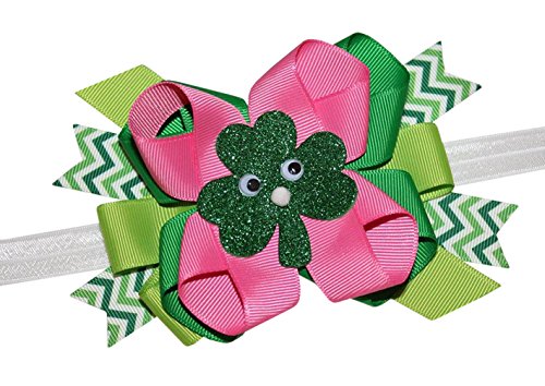 Binding : Apparel Product Description Don't Forget to Wear Green ... New Adorable Wiggle Eyed Shamrock St Patricks Day Hair Bow on Stretch Elastic Headband; Constrasting Chevron, Green Pink Layered Bow with Novelty Wiggle Eyed Shamrock in the Center; Bow Measures Approximately 5" by 4"; Bow is Attached Well to Soft Fold Over Elastic Stretch Headband; Band Measures Approximately 12" Unstretched and 22" Fully Stretched; Individually Made Hand Made in the USA for superior quality design! Safety Note ~ Some Hair Accessories may have small pieces. Never place a small child to bed or leave unattended while wearing this product. 0