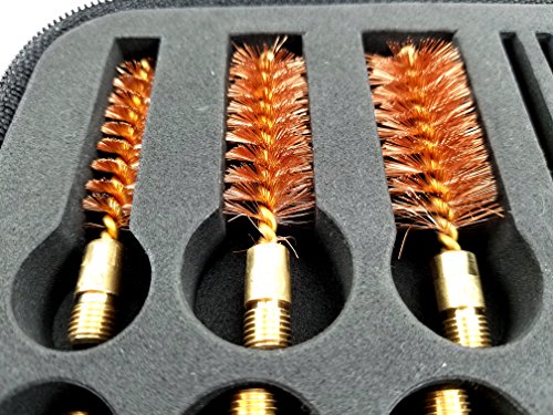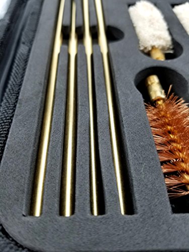 Items included are: 4x brass rods, 3x Bronze brush heads, 3x Mop heads, solid brass adaptor, adapter for cleaning clothes, 50 cleaning patches/swabs, handle bar and compact, padded case for your tools.