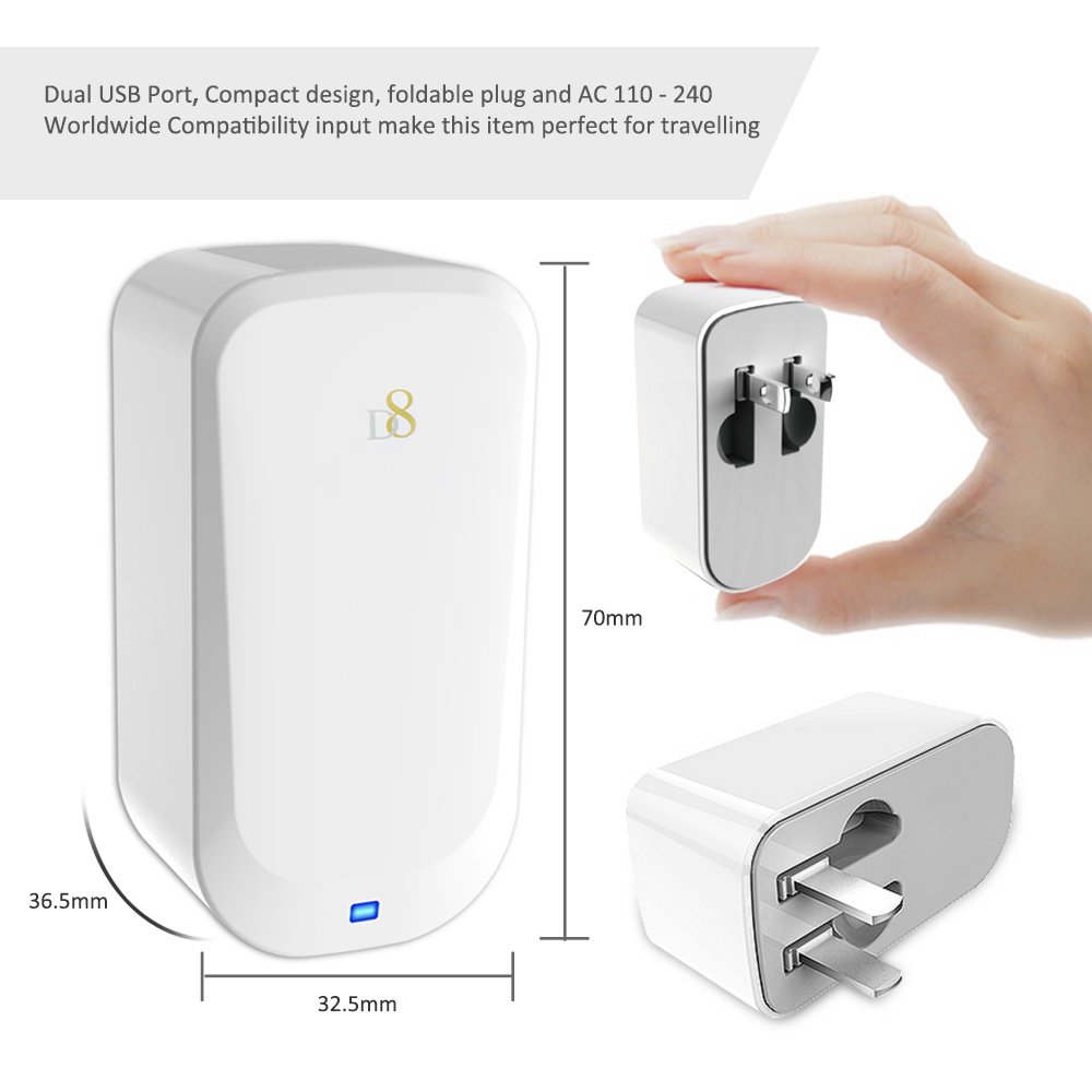 Dual USB Port, Compact design, foldable plug and AC 110-240Worldwide Compatibility input make this item perfect fortravelling