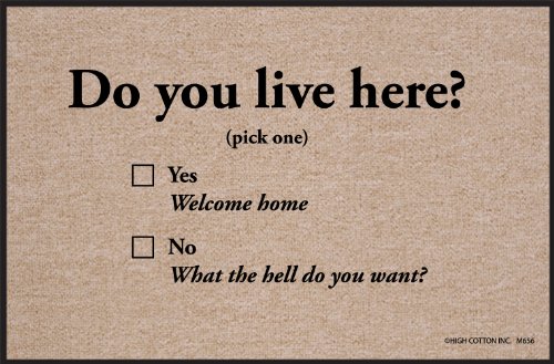 -. Brand : High Cotton -. Feature : Dimensions: 27L x 18W in. / 100% olefin material / Indoor/outdoor usage / Perfect bound stitching / Tan with black non-skid backing -. Label : High Cotton Inc -. Manufacturer : High Cotton Inc -. MPN : M656 -. PackageQuantity : 1 -. PartNumber : M656 -. ProductGroup : Lawn & Patio -. ProductTypeName : OUTDOOR_LIVING -. Publisher : High Cotton Inc -. Studio : High Cotton Inc -. Title : High Cotton Do You Live Here Indoor/Outdoor Doormat