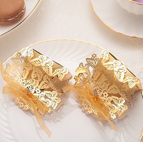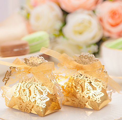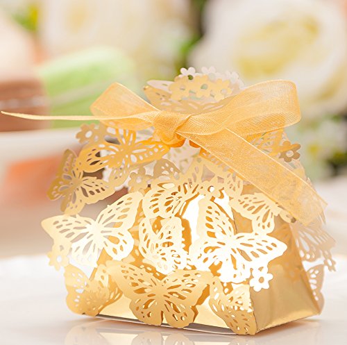 50pcs Party Wedding Favor Candy Box With Ribbon Laser Cut Gold Butterfly Chocolate Gift Boxes Bonbonniere for Birthday Bridal Shower Valentine's Day Christmas Decoration