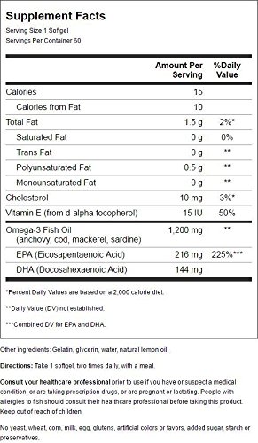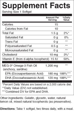 Give yourself the benefits of "good fats" with Natrol Omega-3. With 1,200 mg of healthy, purified fish oil, you can provide your body with a healthy balance of the nutrients your body needs to support eye, heart, and bone health. A natural source of EPA and DHA, Natrol Omega-3 can help you achieve optimum health when added to your daily regimen. Natrol makes this product in the U.S.A.!Feature