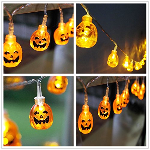 -. Feature : Convenient: Lightweight,flexible and portable. Do not require a plug,easy to store and hang in any place. / Design: Pumpkin shape design,every jack-o-lantern has a grimace on it. It uses 3 AA batteries and it has 2 different modes. Flashing and steady.(Batteries not include). A total of 20 pumpkin string lights. Easily to build a scary festive atmosphere. / Safe: For indoor and outdoor use,safe and waterproof, good heat radiation and never go hot. A soft yellow light does not make your eyes uncomfortable, to protect your health. / Designed with high efficiency LED lighting source, with high brightness. Battery-operated,easy installation, stable and reliable operation, low power consumption with a long service time. / Application: Perfect decoration for Halloween Cosplay theme parties, carnival, festival, Christmas and special occasion, can be used in shopping mall, bar, night party. Add a festive look to your Halloween Family Friends Party.