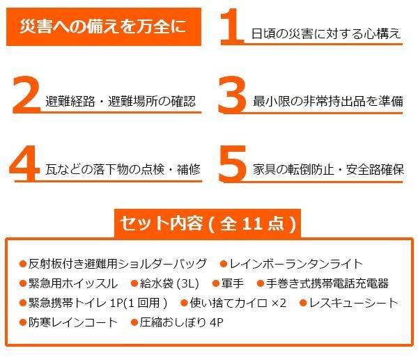 | セット内容 | 反射板付き避難用ショルダーバッグ、レインボーランタンライト、緊急用ホイッスル、給水袋(3L)、軍手、手巻き式携帯電話充電器、緊急携帯トイレ1P(1回用)、使い捨てカイロ×2、レスキューシート、防寒レインコート、圧縮おしぼり4P |