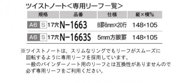 | 仕様 | 規格:A6・S型(タテ型)・17穴 リーフ枚数:30枚(B罫6mm×20行) 最大収容枚数:40枚 |