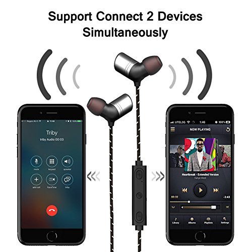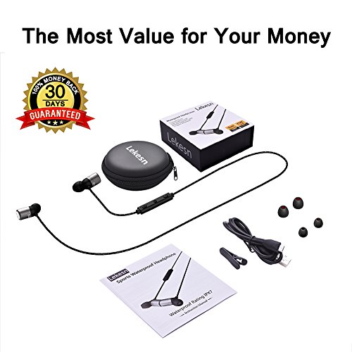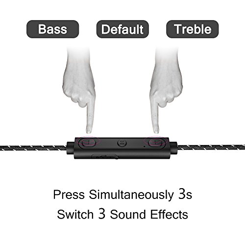 -. Feature : ☛Built-in Magnetic Design: The unique design of magnetic construction, keeps the bluetooth earbuds around your neck firmly, like wearing a necklace and avoid losing them. Meticulous braided earphone cable, you can wear it on your wrist, more fashionbale than the traditional headset cable, making you cool and giving you unexpected fashion feeling. / ☛3 Sound Effects Switching: Our wireless bluetooth headphones comes with three kinds of audio switch: treble, bass, and default - for alternative listening experiences and the right sound to match your music. Press the voice up and down button simultaneously for a while, it will switch to treble mode, bass mode or standard mode automatically. / ☛Advance Technology: Professionally engineered 6mm drivers and equipped with CSR 8640 chip together with bluetooth 4.1, which produces high speed, skip-free audio and anti-interference performance. The connected range is 32ft/10m. (No barriers, walls or other electrical equipments between the headset and the phone.) / ☛Waterproof Function: IPX7 waterproof protects bluetooth earbuds from dripping sweat, a splash from your sports drinks, heavy rain and maybe even in the shower if you really want to. The premium soft silicone gel surface protects bluetooth headset from sweat & moisture. Push yourself to your limit during any outdoor sports. But it can not be used for swimming due to minerals in water which will prevent the bluetooth connection function. / ☛Noise Cancellation Technology: Adopted CVC 6.0 noise cancellation tech, noise cancelling earbuds reduces the outside annoying noise (but not 100% noise cancelling), providing clearer voice and high quality stereo from microphone even you are in noisy environment, allows you to focus on your favorite music and answer calls without skips or missed words.