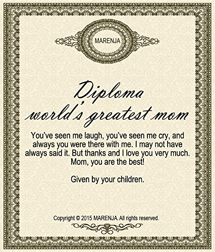 -. Feature : Metal: gold plated alloy, Stone: Austrian Crystal; Glossy and transparent crystal, plated with 18k white gold outside, long-term use without fading. / Weight: 11g, Pendant size: 2,1cm*2,1cm / This heart necklace is designed exclusively for Mothers'Day, original design by MARENJA. The engravings "I Love You, Mom" perfectly express your infinite gratitude and love to your mother. It's a perfect gift for your best mother. / The idea of design: this necklace symbolizes endless gratitude and love. The inlaid heart is the child, and the ring around it is the mother. Mother's love will always be with you wherever you go. / The necklace is packed in a fine gift box, so you can give the gift to your mum directly. Amazon takes care of the shipping. And also a surP.R.Ise gift and the unique World's Greatest Mom Diploma for you. The World's Greatest Mom Diploma: You've seen me laugh, you've seen me cry, and you were always there with me. I may not have said it. But thanks and I love you very much. Mom, you are the best! Given by your children.