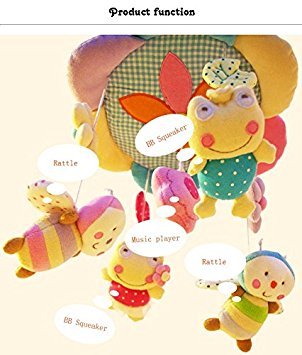 PLUSH TOYS--It is more than a musical mobile. As your baby becomes more the hanging characters can be taken off as small rattle toys. Your baby will have deep feelings with the characters on the mobile that she/he's been watching for months. There is a built-in BB squeaker, a jingle bell or a rattle inside of the handhold part of each toy, which increase the fun of playing.