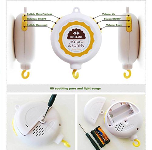 GURANTEE--SHILOH baby musical crib mobile is adopted environmentally non-toxic and durable ABS material to ensure baby safety in case of biting them. All our high quality products are made by manufactures with ISO authentication, which meets or exceeds the ASTM standards of toys.
