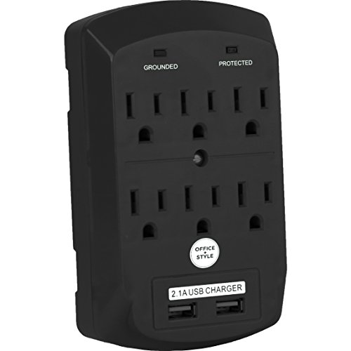 Studio : BHRS Group - Office Supplies Publisher : BHRS Group - Office Supplies Binding : Office Product Product Description The Office Style 6 Outlet Wall Mount Surge Protector with Dual USB Ports offers economical AC surge suppression for protection of workstations, desktop PCs, tele systems, or other sensitive electronics. The build-in surge suppression protects connected equipment and electronics from any performance damage due to faulty surges. It’s 900 joule rating makes it much more efficient than standard wall outlet adapters. It is equipped with two 2.1 AMP USB ports for charging electronics via USB cords such as phones and tablets. The surge protector has 2 indicator lights to verify grounded and protected at a glance. The surge protector is ETL listed for guaranteed safety. 0
