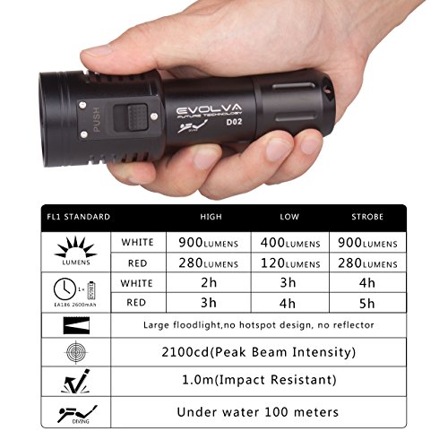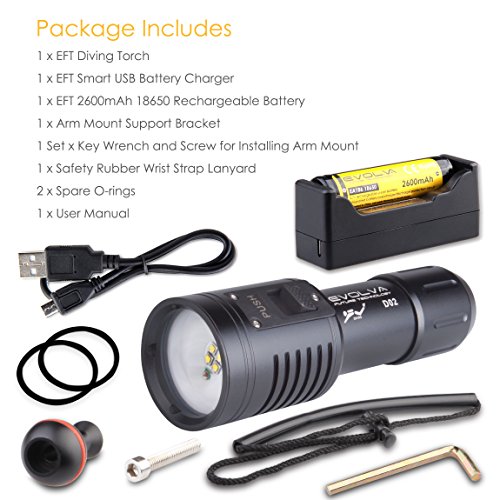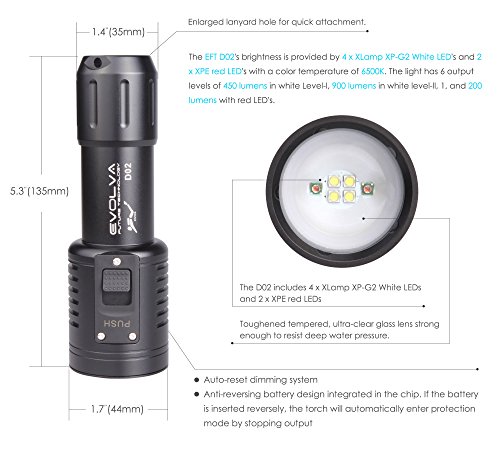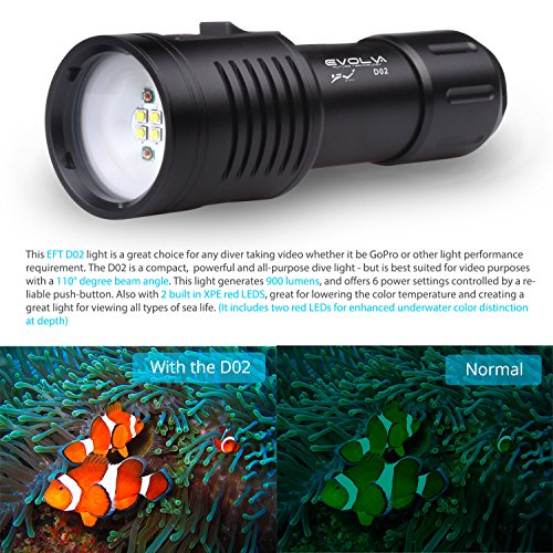 PHOTO/VIDEO LIGHT: This EFT D02 light is a great choice for any diver taking video whether it be Go Pro or other light performance requirement. The EFT D02's brightness is generated by 4 x XLamp XP-G2 White LEDs and 2 x XPE red LEDs with a color temperature of 6500K. Equipped with 2 built in XPE red LEDS, D02 is great for lowering the color temperature and creating a great light for viewing all types of sea life.