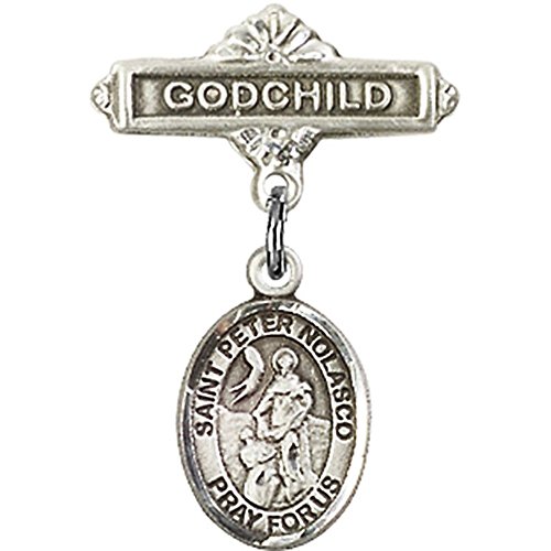 -. Title : Sterling Silver Baby Badge with St. Peter Nolasco Charm and Godchild Badge Pin 1 X 5/8 inches