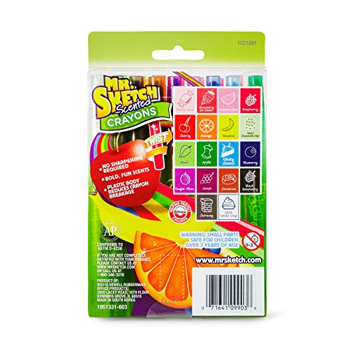 Studio : Newell Rubbermaid Office Publisher : Newell Rubbermaid Office Binding : Office Product Product Description Featuring a smooth-coloring gel formula, these scented crayons glide across the page. An exciting array of bold colors and juicy scents help spark creativity in kids and adults alike. The innovative twist-up design means these handy crayons never need sharpening. Hard plastic body helps reduce crayon breakage, so there's nothing holding back your child's imagination. Crayons even come with a convenient storage case, for coloring on the go. Assorted scents and colors make for a fabulously fun coloring experience, including: Red Cherry, Orange Orange, Yellow Banana, Green Apple, Blue Blueberry, Purple Grape, Brown Cinnamon, Black Black Raspberry, Pink Watermelon, Light Green Mint, Light Blue Stinky Cheese, White Sugar Cookie, Light Pink Bubble Gum, Dark Pink Raspberry, Light Purple Sugar Plum, Grey Chimney, Amaranth Strawberry, Teal Green Mint Chocolate Chip. Colors: 18 Assorted Assortment: Red Cherry Orange Orange Yellow Banana Green Apple, Blue Blueberry Purple Grape Brown Cinnamon Black Black Raspberry Pink Watermelon Light Green Mint Light Blue Stinky Cheese White Sugar Cookie Light Pink Bubble Gum Dark Pink Raspberry Light Purple Sugar Plum Grey Chimney Amaranth Strawberry Teal Green Mint Chocolate Chip Size Group: Medium. 0