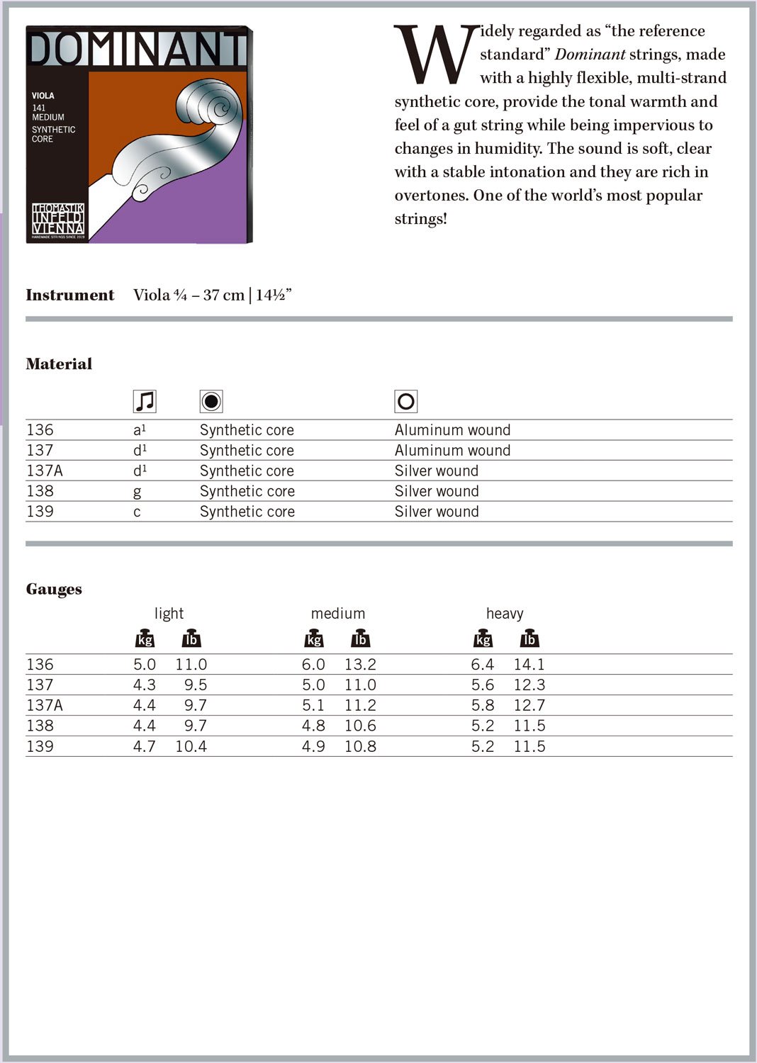Dr Thomastik-Infeld141 Dominant Viola Strings Complete Set Medium Tension 4/4 Size 15 Perlon Core