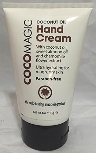 -. Feature : CocoMagic Coconut Oil Hand Cream 4 oz / With coconut oil, sweet almond oil and chamomile flower extract Ultra hydrating for rough, dry skin / This luxuriously rich hand cream drenches skin in velvety smoothness / Enriched with hydrating coconut oil and chamomile flower extract, / t calms and softens dry hands and cuticles.