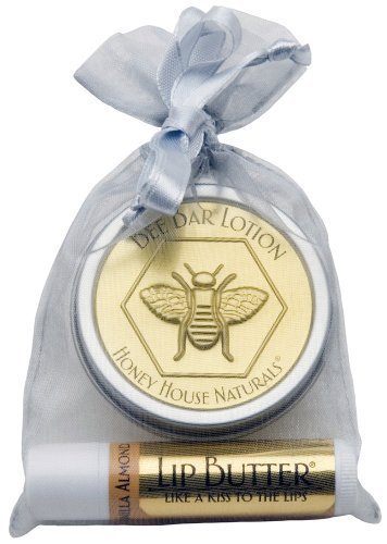 -. Feature : One small vanilla bee bar and one vanilla almond lip butter in a lovely gold organza bag / Convenient set for all over moisture on hands, heels, elbows and lips / No parabens and never tested on animals / Unique, beautiful and practical gift for someone who already has it all / Perfect little tuck-in gift for you favorite someone