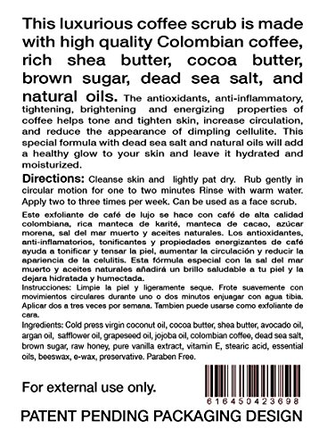 This luxurious scrub + Body Butter (DUO SET). Scrub is made with rich coffee butter,exfoliating pure cane sugar and dead sea salt brings a healthy glow to your skin. It helps to tone and tighten skin, increase circulation and reduce the appearance of dimpling cellulite. Our Body Butter: is a very hydrating non-greasy formulation made will all natural ingredients, for a healthier, softer, smoother and nourish skin. Silky skin. Why Colombian coffee is one of the best Coffees in the world? Colombia is right in the middle of the world, so every day enjoying the sunshine for a long time, this favorable tropical climate and geography characteristic of the Andes are added. In the midst of the regions of Quindio, Risaralda, Caldas and Valle del Cauca is famous triangle coffee Colombia, with mountains, valleys, rivers, mountains and snowy peaks that come together like a miracle sent from heaven. The lush Colombian cultural landscape produces some of the best coffee beans in the world. From inside the Colombia coffee trees, volcanic soil (mainly in Quindio) produces the best quality Arabica beans are grown, harvested and washed in local plantations. So it is not surprising that even in Colombia there is only one kind of coffee-coffee Arábica- there are many varieties of the same to which they are known for their high quality in a delicate production process. Colombian coffee is recognized as the best coffee in the world and in several countries as a gastronomic excellence ROAST LEVEL in OUR FORMULA: Our DELUGE COFFEE SCRUB is made in the USA, the COFFEE GROUNDS are imported from Colombia, it is specially hand roasted for our formulation at a level that is light/medium so it brings out the best flavors in the coffee that have begun caramelization but don't yet have any burnt or chocolately darkness to them. This roast level often brings out a balanced complete coffee with lots of possible flavors: citrus, fruit, berry, acidity.Feature