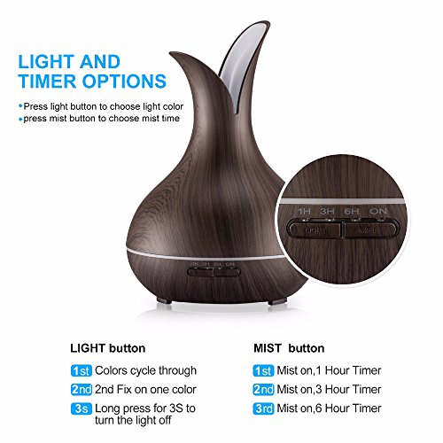 - Elegant vase design, wood look with a smooth finish, made of BPA free materials. Add a few drops of your preferred essential oil to give your room a fresh and vibrant aroma. The cool mist will create a relaxing atmosphere. This diffuser is also a decorative piece that will enhance your room, office, yoga room, spa, hotel etc.