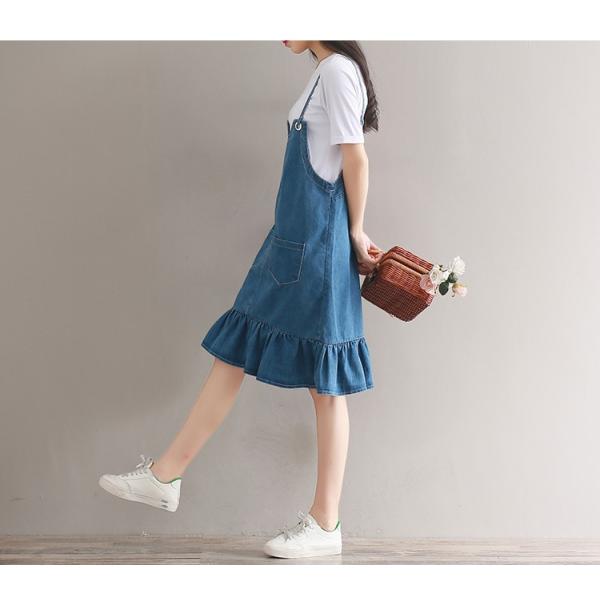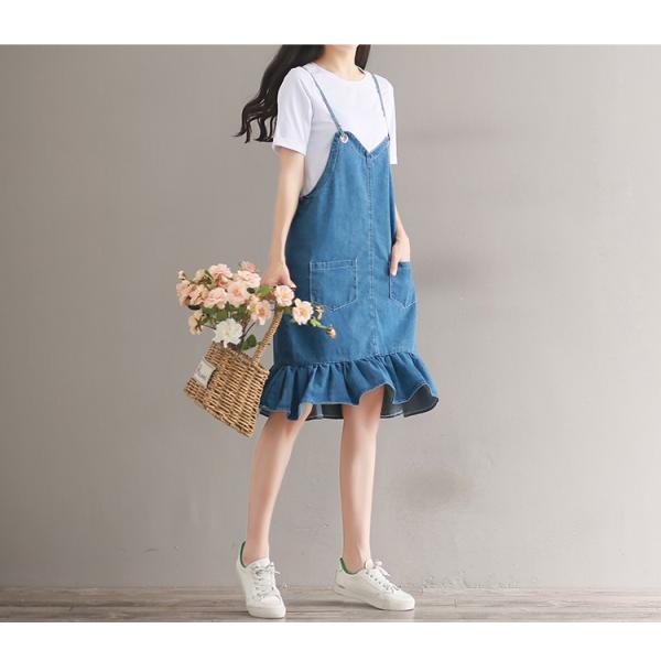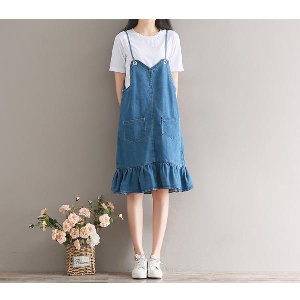 裾フリルや肩ストラップなど可愛い要素いっぱいのデニムワンピース。