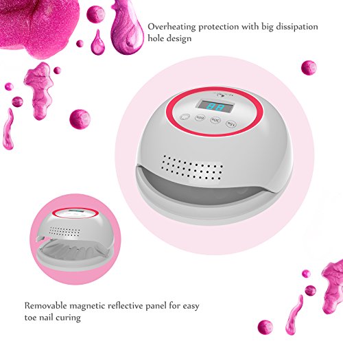 Heat Dissipation Design The big hole protects the nail dryer from too much warmth, safeguarding you from discomfort and the machine from overheating. For even further comfort, the magnetic reflective panel can be removed, making the curing of your pedicure a breeze. 0