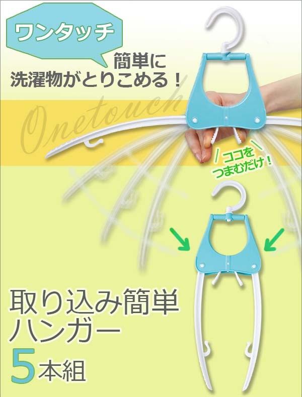 | 首まわりを伸ばさず簡単に干せて、ワンタッチで素早く洗濯物が取り込める、取り込み簡単ハンガー5本組。本体中央のクリップをつまむと、ワンタッチで肩部分がたたまれ、衣類がストンと外れます!そして、首まわりからハンガーを差し込み、左右のアームを伸ばせば簡単に洗濯物を干すことができ、家事の中でも時間のとられる洗濯をいっきに効率よく進めることができます!洗濯ハンガー/時短/かんたん/とりこみ/コンパクト/ランドリーグッズ/折りたたみ |