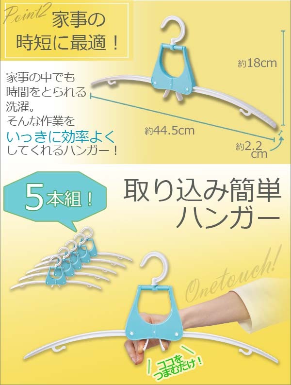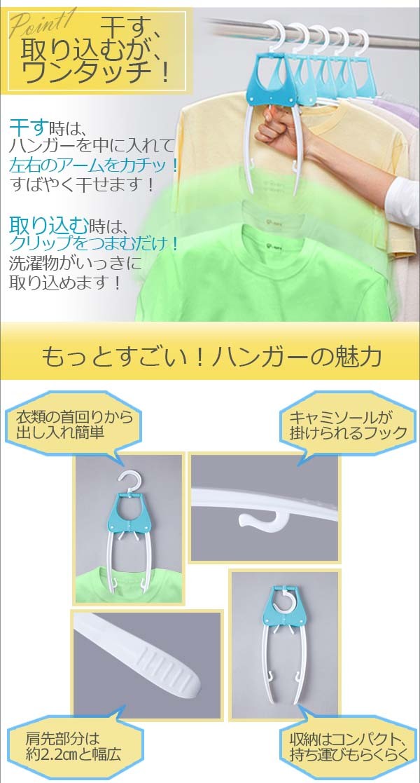 | 洗濯物の首まわりを伸ばすことなく、簡単に干せて、ワンタッチで素早く取り込める、取り込み簡単ハンガー5本組。中央のクリップをつまむと、ワンタッチで肩部分がたたまれ、衣類がストンと外れます!そして、首まわりからハンガーを差し込み、左右のアームを伸ばせば簡単に洗濯物を干すことができます!家事の中でも時間のとられる洗濯をいっきに効率よく進めることができます! |