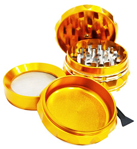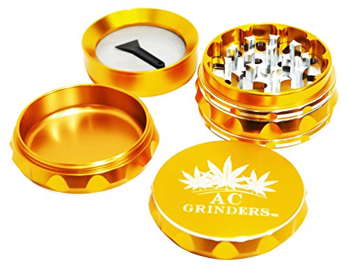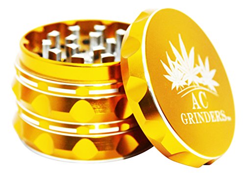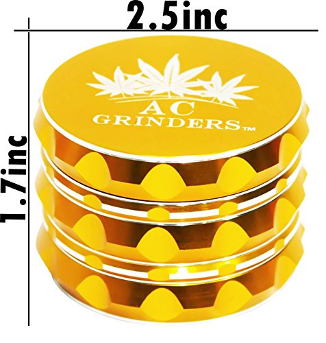 AC GRINDERS #1 Best 4 Piece Large Spice Herb Grinder 2.5 Inch with Pollen Catcher - Crafted from Heavy duty Aluminum alloy + Bonus 2 Inch Non-Stick Silicone Jar (GOLD)