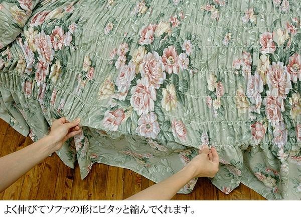 きめの細やかな縫製のシャーリング製法により、ソファへのフィット感は抜群!!ローズブーケのフラワーデザインが地のグリーンカラーとよくマッチし、お部屋の雰囲気をエレガントに演出します。立体的な仕上がりで、多くの袖付きソファにピッタリとフィットし、裾はスカートデザインで優しい表情が素敵です。洗濯機で丸洗いができます。 |