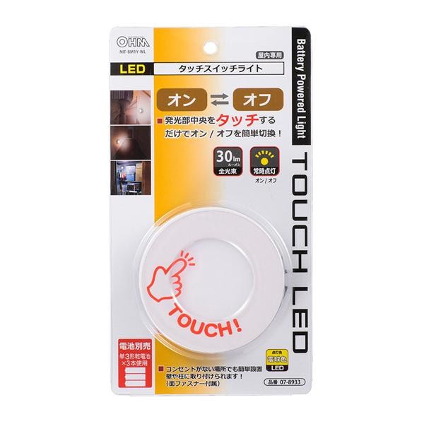発光部中央をタッチするだけでオン・オフの切換ができるLEDライトです。 製造国:中国 付属品:取扱説明書兼保証書(保証期間1年)面ファスナー×1セット ※サプライヤー直送品 ご注文後2~3営業日後の出荷となります【商品名】オーム電機 OHM LEDタッチスイッチライト NIT-BM1Y-WL