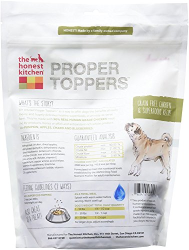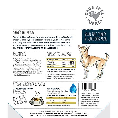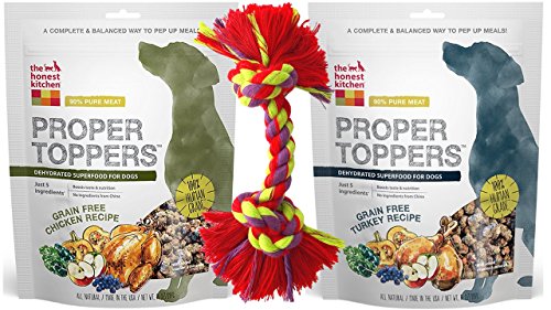 -. Binding : Misc. -. Brand : Honest Kitchen -. EAN : 0752454686728 -. Feature : 100% Human Grade; Made in the USA / 90% Pure Meat / Just 5 Ingredients / Colorful 8" Double Knot Rope Toy (colors vary) with floss ends for help cleaning teeth adds fun play time for puppy / Convenient 2 flavor sampler - One bag of each -. Label : The Honest Kitchen -. Manufacturer : The Honest Kitchen -. PackageQuantity : 3 -. ProductGroup : Pet Products -. ProductTypeName : PET_SUPPLIES -. Publisher : The Honest Kitchen -. Studio : The Honest Kitchen -. Title : The Honest Kitchen Proper Toppers Grain Free Superfood For Dogs 2 Flavor with Toy Bundle, (1) Each: Chicken and Turkey, 5.5 Ounces -. UPC : 752454686728