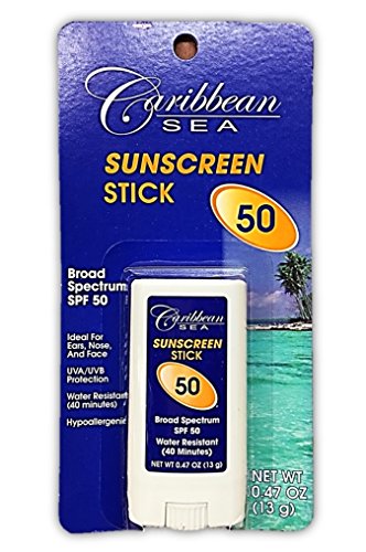 Caribbean Sea Sunscreen Stick provides SPF 50 sun protection for spot protection of the ears, nose, lips and face. Water resistant up to 40 minutes. Hypoallergenic and vitamin enriched. Made in the USA!