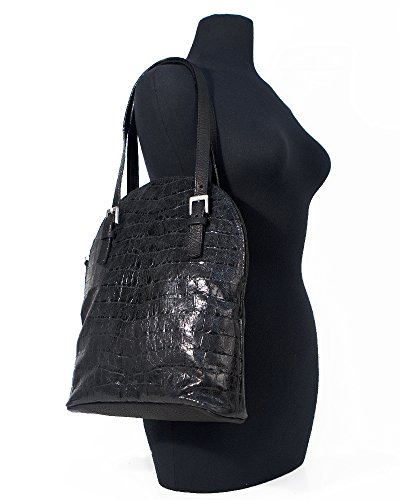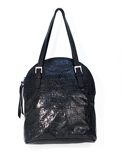 - BLACK LEATHER SHOULDER BAG: Features a large stylish black shoulder bag made of genuine gator-embossed leather with two short adjustable shoulder straps, top zipper closure and side tassel. The bag comes with an internal pocket and is quite spacious.