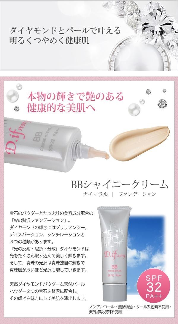 | 成分 | 水、シクロペンタシロキサン、酸化チタン、BG、グリセリン、ジメチコン、イソノナン酸イソノニル、PEG-9ポリジメチルシロキシエチルジメチコン、イソステアリン酸ポリグリセリル-2、酸化鉄、水酸化Al、加水分解ヒアルロン酸、加水分解コラーゲン、テトラヘキシルデカン酸アスコルビル、ホホバ種子油、オリーブ油、ラウロイルグルタミン酸ジ(フィトステリル/オクチルドデシル)、白金、銀、アスタキサンチン、ローヤルゼリーエキス、ビルベリー葉エキス、ローズヒップ油、ラベンダーエキス、センチフォリアバラ花水、ゼラニウム油、リナロール、ローズマリー油、カミツレ花エキス、アロエベラ葉エキス、ダイヤモンド末、パール、(ジメチコン/(PEG-10/15))クロスポリマー、(加水分解シルク/PG-プロピルメチルシランジオール)クロスポリマー、ジステアルジモニウム ヘクトライト、イソステアリン酸、シリカ、ステアロイルグルタミン酸2Na、トリ(カプリル酸/カプリン酸)グリセリル、セルロースガム、炭酸水素Na、合成金雲母、ハイドロゲンジメチコン、DPG、塩化Na、クエン美容液・美容クリーム・日焼け止め・化粧下地・ファンデーション・コンシーラーの6つの機能がこれ1本に☆宝石のパウダーとたっぷりの美容成分を配合した 「Wの贅沢ファンデーション」。天然ダイヤモンドパウダー&天然パールパウダー2つの宝石を贅沢に配合し、その輝きを味方にして美肌を演出します。 製造国:日本 成分:水、シクロペンタシロキサン、酸化チタン、BG、グリセリン、ジメチコン、イソノナン酸イソノニル、PEG-9ポリジメチルシロキシエチルジメチコン、イソステアリン酸ポリグリセリル-2、酸化鉄、水酸化Al、加水分解ヒアルロン酸、加水分解コラーゲン、テトラヘキシルデカン酸アスコルビル、ホホバ種子油、オリーブ油、ラウロイルグルタミン酸ジ(フィトステリル/オクチルドデシル)、白金、銀、アスタキサンチン、ローヤルゼリーエキス、ビルベリー葉エキス、ローズヒップ油、ラベンダーエキス、センチフォリアバラ花水、ゼラニウム油、リナロール、ローズマリー油、カミツレ花エキス、アロエベラ葉エキス、ダイヤモンド末、パール、(ジメチコン/(PEG-10/15))クロスポリマー、(加水分解シルク/PG-プロピルメチルシラン【商品名】本物の宝石を配合した化粧品!D.ifstory (ディフストーリー) BBクリーム BBシャイニークリーム(ナチュラル) SPF32PA++ |
