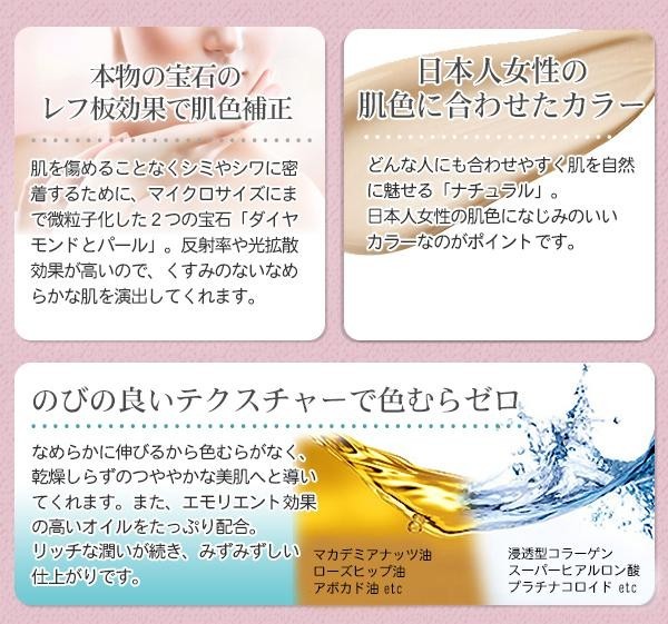 | 美容液・美容クリーム・日焼け止め・化粧下地・ファンデーション・コンシーラーの6つの機能がこれ1本に☆宝石のパウダーとたっぷりの美容成分を配合した 「Wの贅沢ファンデーション」。天然ダイヤモンドパウダー&天然パールパウダー2つの宝石を贅沢に配合し、その輝きを味方にして美肌を演出します。 |