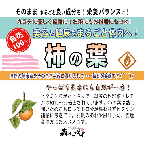 | 柿の葉 |  | | KAKINOHA 東アジアを原産とする柿は、栄養価が非常に高く、ビタミンCやカリウムが豊富に含まれています。 大量のビタミンCを含む柿の葉は、なんと、レモンの10倍~20倍といわれています。 また、熱に強いため、お茶にしてもその成分が失われることなく、体内に吸収され、毎日のビタミン補給には欠かせない柿の葉です。 無添加・天然柿の葉100%のとても優れた食品です。 美容健康にもとても良いので、多くの女性に飲み親しまれています! |