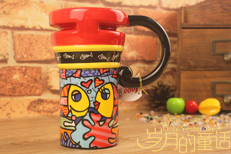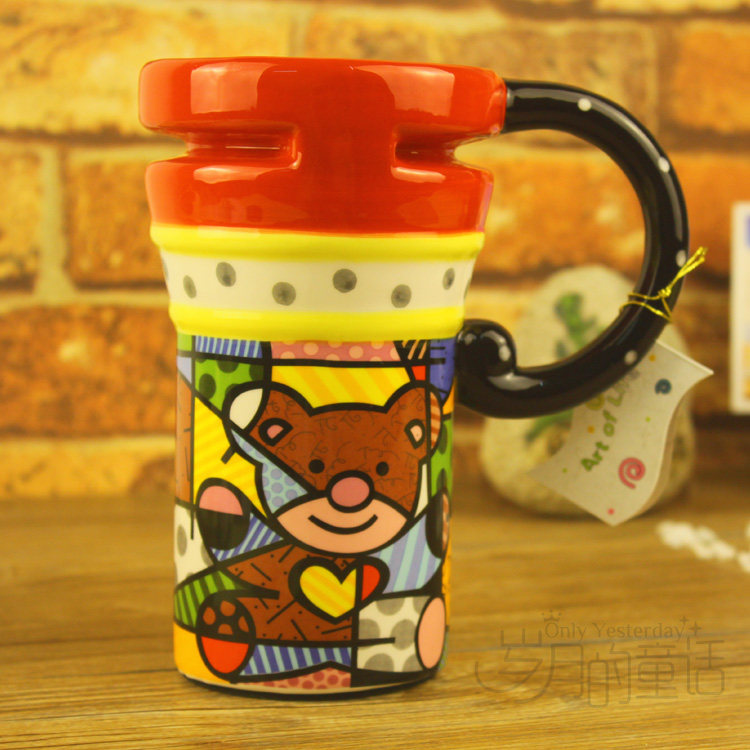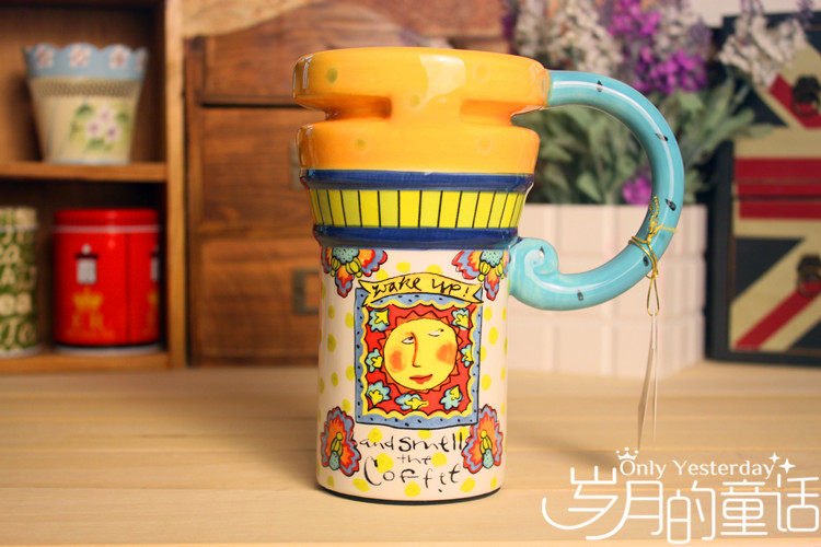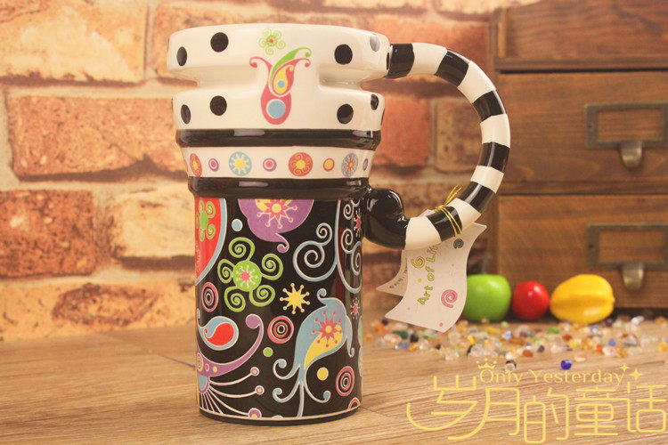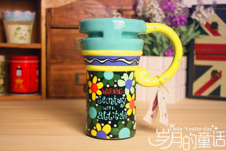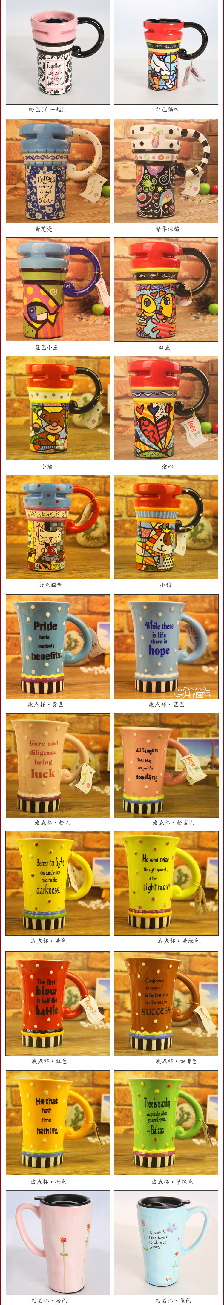 Material: cup body main components: dolomite 80%, 5% pigment, glaze 15%; ????? Green plastic lid for the PV; ?????? Bottom of the cup to the compressed foam insulation; Size: height of about 16CM, cup diameter of about 9CM, bottom of the cup diameter of about 9CM, handle length of about 9CM Capacity: 450 ML Features: 1. eye-catching bright colors, big gap can be inserted straw, small gap can not teabags ?????? 2. The bottom of the cup is designed with non-slip mats, non-slip, insulation, bottom of the cup to clean ?????? 3. The cup can control the flow of water, easy Sapo ?????? 4. Cup grasp good sense