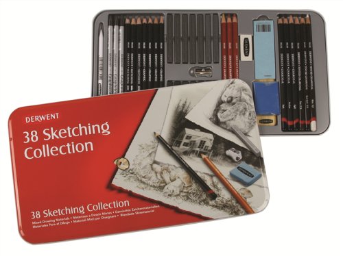The Derwent sketching collection is an imaginative mix of innovative drawing and sketching media, including Drawing, Pastels and watersoluble Sketching Pencils, plus traditional products like Natural Graphite and Compressed Charcoal Blocks. It’s the ideal gift for the serious drawing student for creating quick freestyle sketches to more advanced drawing projects. A metal tin holds the assortment and other accessories. 24 count set includes: 1 watersoluble graphitone stick (2B), 3 graphite blocks (Soft, Medium, Hard), 3 charcoal blocks (Light, Medium, Dark), 3 watersoluble sketching pencils (4B, HB, 8B), 2 graphic pencils (3B, HB), 2 drawing pencils (Brown Ochre and Terracotta), 3 tinted charcoal pencils (Peat, Burnt Earth, White), 3 charcoal pencils (Light, Medium, Dark), metal pencil sharpener, and kneadable eraser.