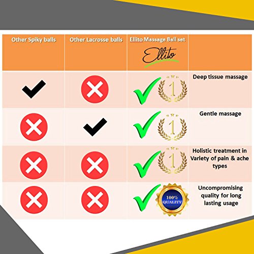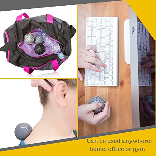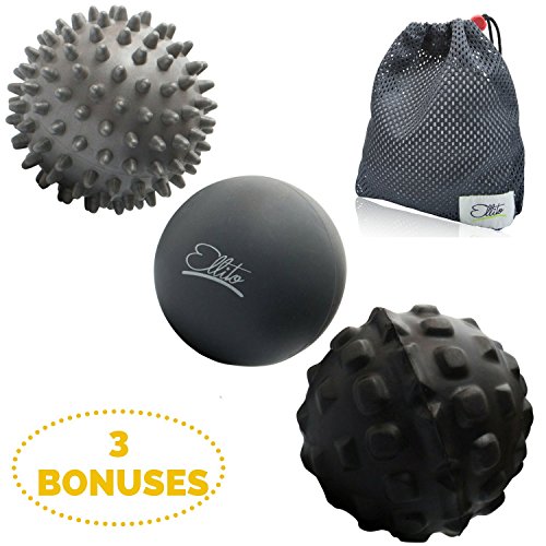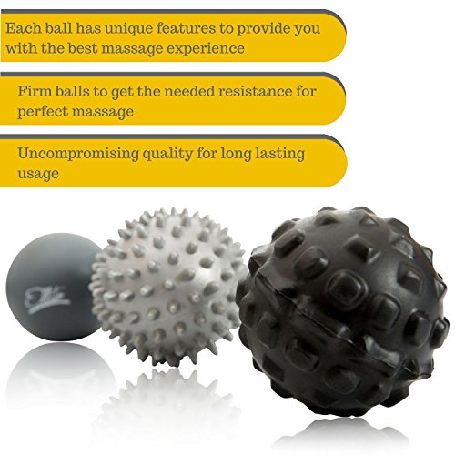 Therapeutic Massage Ball Set: Eliminate Pain! Rubber, Spikes & Foam Roller Massager Balls. Myofascial Release, Trigger Point & Plantar Fasciitis Therapy. Releases Muscle Aches: Thigh, Back, Knee, etc