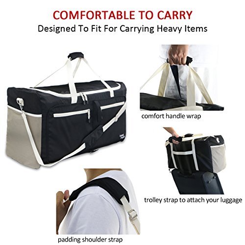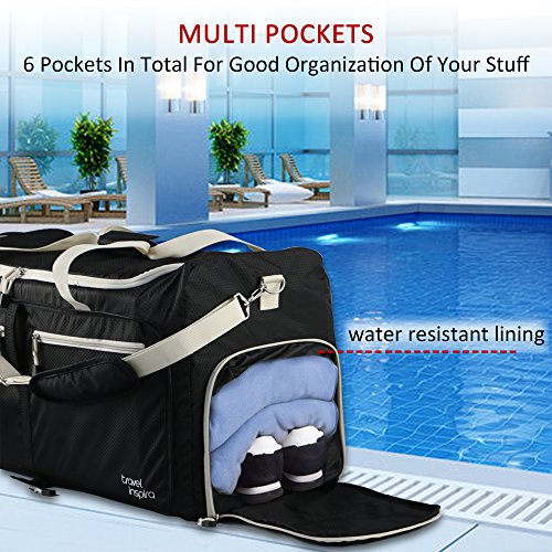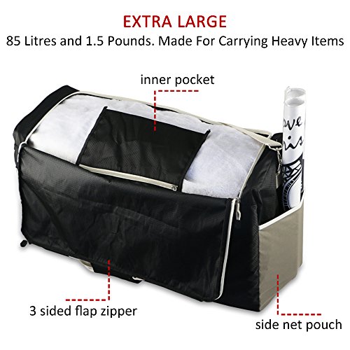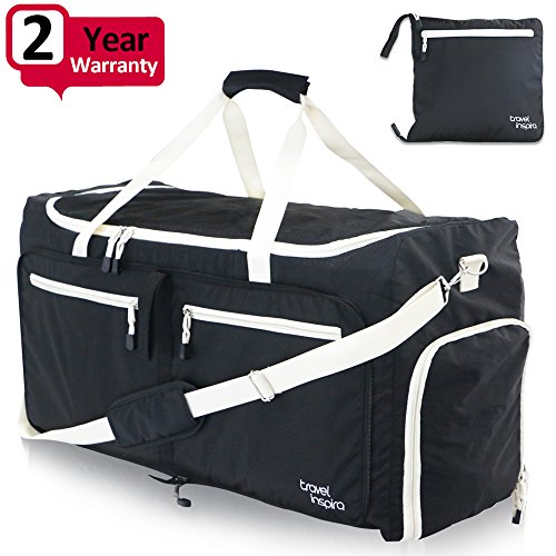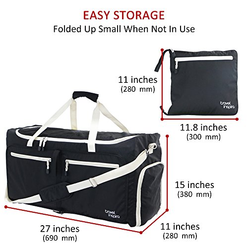 -. Brand : Travel Inspira -. ClothingSize : 85L -. Color : Black -. EAN : 0733520991205 -. Feature : EXTRA LARGE : 11 x 15 x 27 inches (28 x 38 x 68.5 cm) with 85 Litres capacity and 1.5 pounds. / Durable :YKK double zippers for strong and easy pull with pull strings for TSA lock. Stainless steel fixture connects the bag and the strap with strong support. Ripstop fabrics are lightweight, water-resistant to resist tear and wear. / COMFORTABLE TO CARRY : Velcro attached wrapping handle increases the comfort to carry, and the padding shoulder strap is of great help when transporting heavy items. The trolley strap on one side of the bag makes it easy to attach on top of your lage and enable you to move fast. / MULTI-POCKETS : 6 pockets in total, including 1 main compartment, 1 shoe pocket, 1 net side pouch, 2 outside pockets and 1 inner pouch. Made of water resistant lining, the shoe bag enables you to put something wet inside without polluting your other stuff. / PACKABLE : Easily zip the bag into itself to transform it into a small versatile carry bag for later use. Folds Up size 11.8 x 12.6 inches (30 x 32 cm). 2 year warranty. -. IsMemorabilia : 0 -. Model : TIFB02-BK -. PackageQuantity : 1 -. ProductGroup : Apparel -. ProductTypeName : LAGE -. Size : 85L -. Title : Travel Inspira Large Foldable Duffel Bag XL For Packable Duffle Lage Gym Sports -. UPC : 733520991205