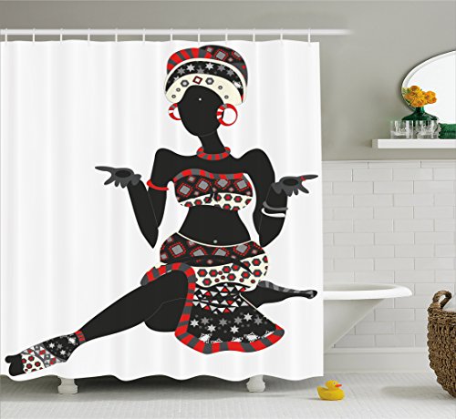 African Woman Shower Curtain by Ambesonne, Local Lady Indigenous Ethnic Patterned Dress Gesture Silhouette, Fabric Bathroom Decor Set with Hooks, 70 Inches, Charcoal Grey Vermilion