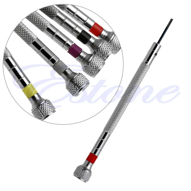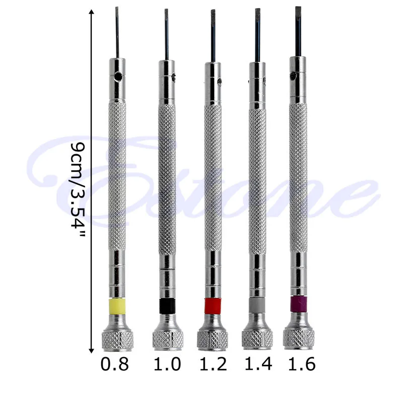 Features: Repair and open up your watch with this functional screwdriver set; Economy 5-piece screwdriver set for watch repair and eye glass repair of all kinds; Easy to use and makes a necessity in your repair tool kit. 5 pcs Slotted Screwdrivers sizes: 0.80mm ~0.03150 inch 1.00mm ~0.03937 inch 1.20mm ~0.04724 inch 1.40mm ~0.05512 inch 1.60mm ~0.06299 inch