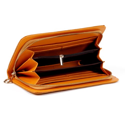 Organize cash and credit cards in style inside this soft vintage leather clutch wallet from DAMARA. This Clutch wallet features a slim shape and an elegant design.This wallet has a secure zipper around closure and a well organized interior that includes 6 card slots to hold credit cards, debit cards, and photo ID, a center zippered dividing compartment to hold loose change, 3 large pockets, and plenty of storage for cash, important papers, and receipts.