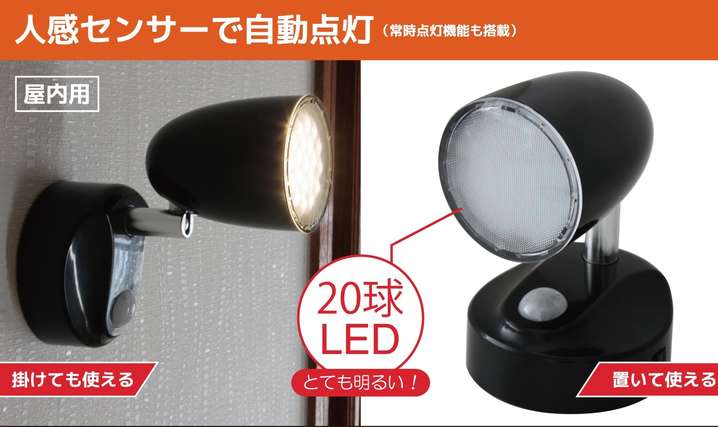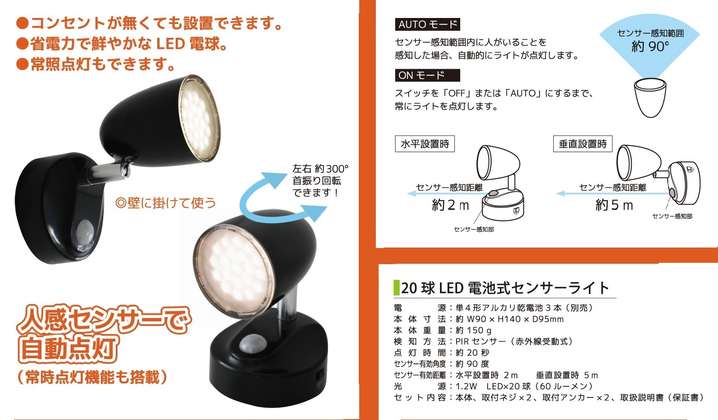●機能:検知方式:PIRセンサー(赤外線受動式)、電源:単4形アルカリ乾電池3本(別売り)、点灯時間:約20秒、センサー有効角度:約90度、センサー有効距離:水平設置時:約2m 垂直設置時:約5m、光源:1.2W LED×20球(60ルーメン)