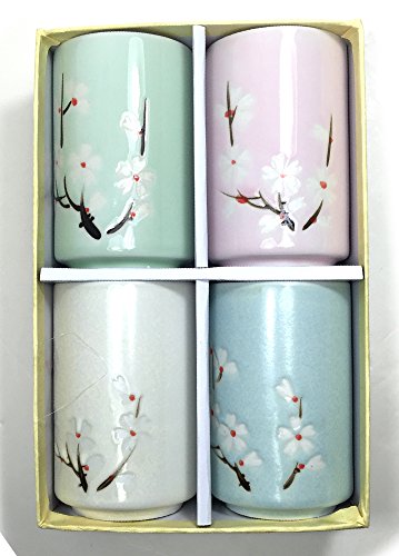 -. Feature : Assorted 4 color tea cup set light blue,light pink,light green and pearl. Each colors symbolizes the four season winter spring summer and autumn. The natural beauty of the cherry blossom differs as each season changes. / This sushi restaurant style tea cups measure approximately 3.15 inches and 4.15 inches tall. Capacity 5.5 oz. You can use it for both hot or drink beverage. Perfect for Japanese Matcha / Made of high quality ceramic and hand painted with traditional Japanese Cherry Blossom which represents beauty, life and tranquility. The cups are dishwasher and microwave safe / This traditionally crafted ceramic set will fit right in with any home decor with zen elements / Comes with easy packed gift box, a wonderful gift idea. Perfect for house warming, birthdays, wedding, graduation, business gift or almost any occasion